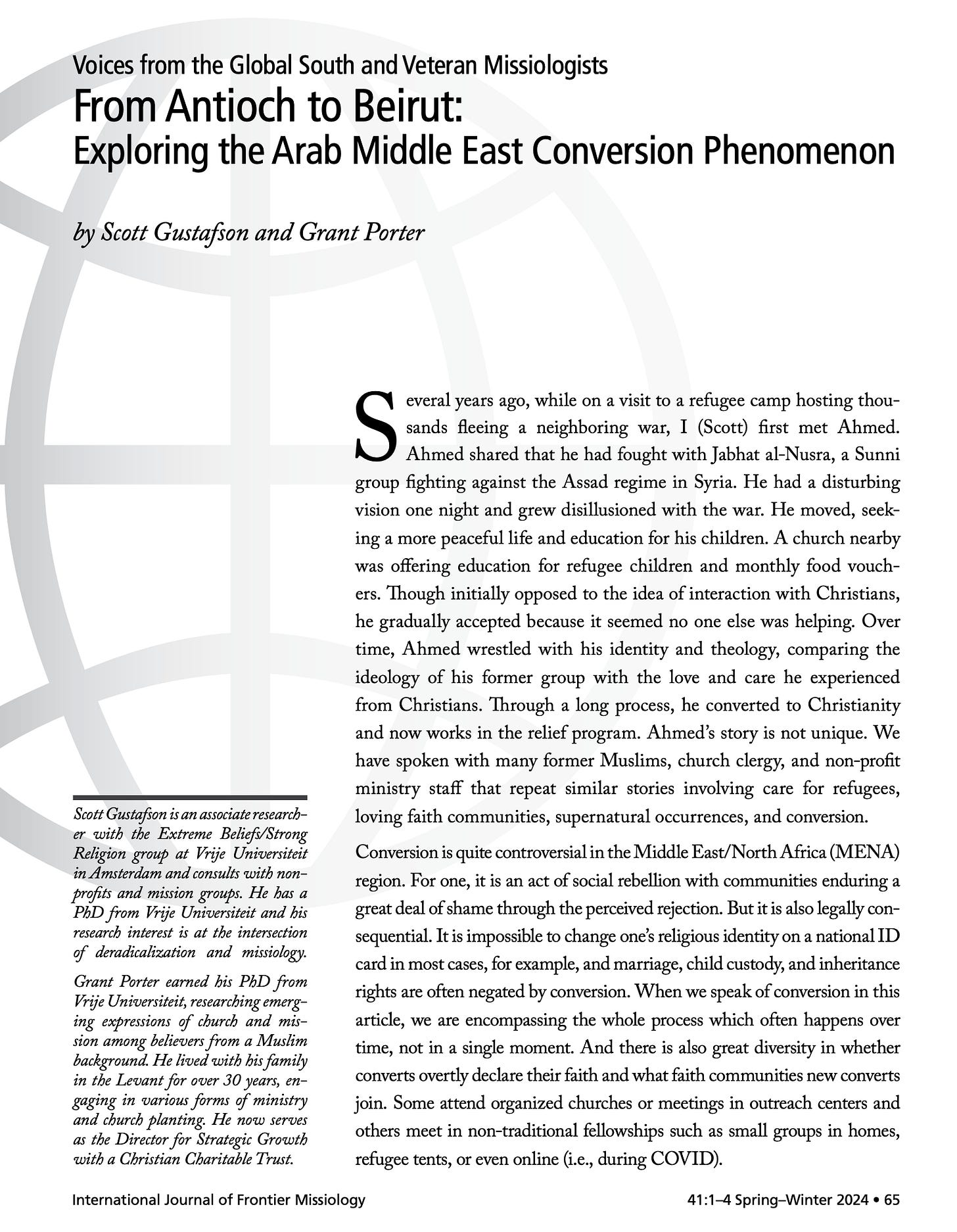 “The conversion phenomenon underway in the MENA region is being written by marginalized groups in a context of war and precarity who move in directions opposite prevailing forces of culture and politics. In contrast to a historical emphasis on the story of “empire,” the history of global Christianity is written by migrants and disempowered groups. We see missional Christians in the MENA offering a compelling alternative to the status quo: a surprising alternative community in a hostile and chaotic milieu. These communities are living as a “sign, foretaste and instrument of the coming Kingdom” that Jesus inaugurated. The next chapter of global Christianity is being written in the MENA, authored by the refugee and Arab evangelical church in the Middle East.”